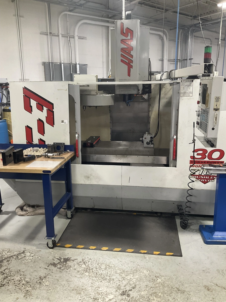 1998 Haas VF-3 with 10,000 RPM Spindle, 30 HP Geared Motor, 20 ATC, Programmable Coolant, Rigid Tapping, and Haas HA5C 4th Axis.