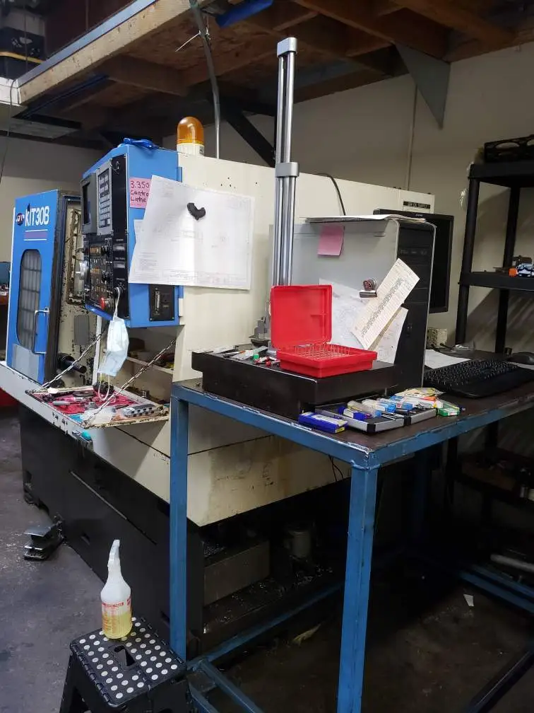 2000 KIA KIT30B CNC Slant Gang Tool Turning Center with Yasnac J50L Control, Parts Catcher, Gang Tool Turret, and Collet Chuck.