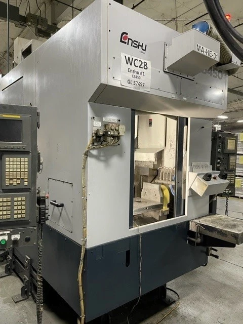 2007 Enshu ES450 Vertical Machining Center with Fanuc 18i-MB Control, 12,000 RPM, CAT-40 Spindle, 20 Station ATC, Through Spindle Coolant, Nikken 4-Axis Rotary Table, High Pressure Coolant, and Chip Conveyor