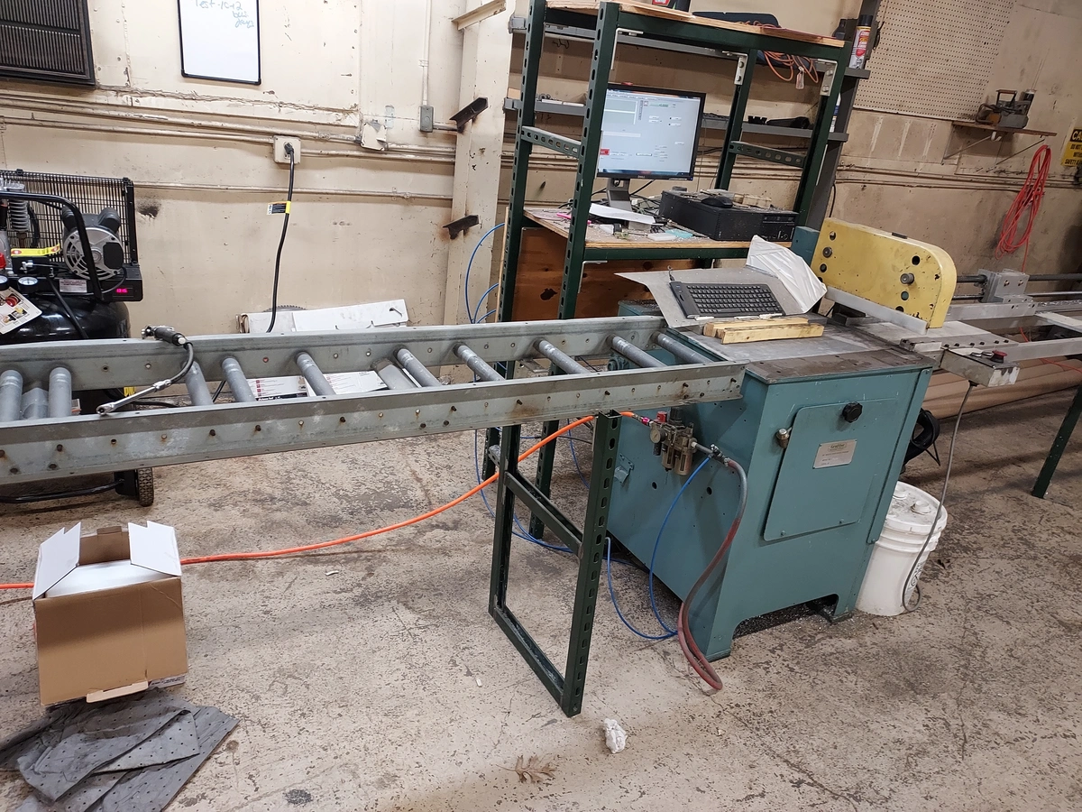 Grutter Model 1603 Upcut Saw with 16" Blades, 7.5 HP Baldor Motor, 26" x 26" Table, 2" Thick x 12" Wide Capacity. Machine has Rollers, and Custom Backstop
