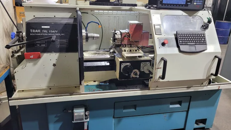 2002 SWI Trak Model TRL 1540V CNC Flat Bed Lathe with ProtoTrak VL CNC Control (2019), Dual Electronic Handwheel, Collet Chuck, 8-Station Turret, and Tailstock. Machine is Under Power for Inspection.