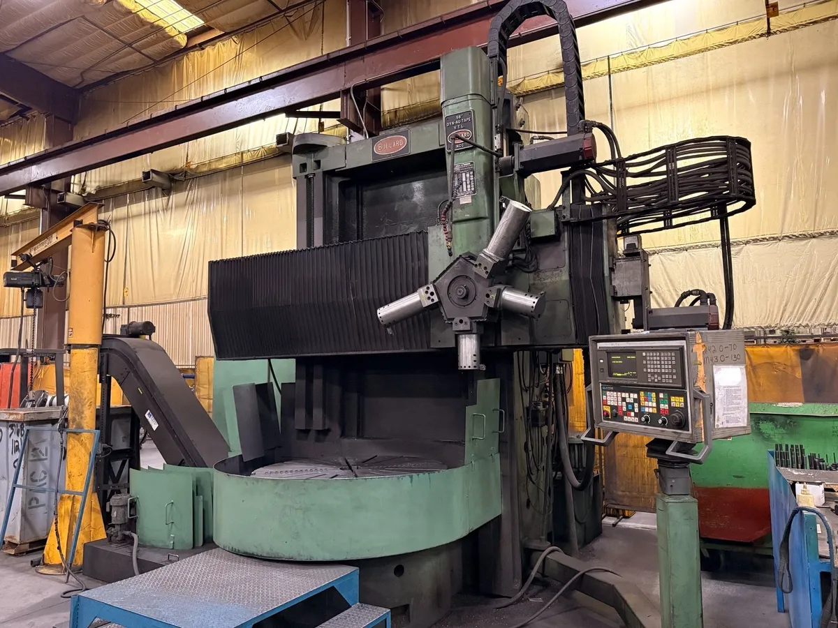 1991 Bullard 56" CNC "DYN-AU-TAPE" VTL - Retrofitted with Fanuc 18-T CNC Control in 1991, 4-Jaw Hydraulic Chuck, 5 Side Power Indexing Turret, and Chip Conveyor.